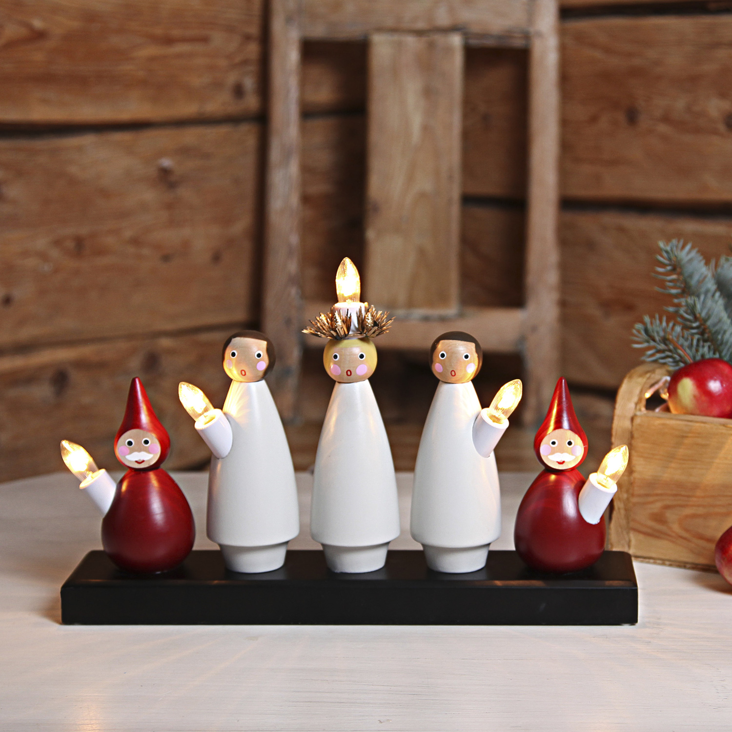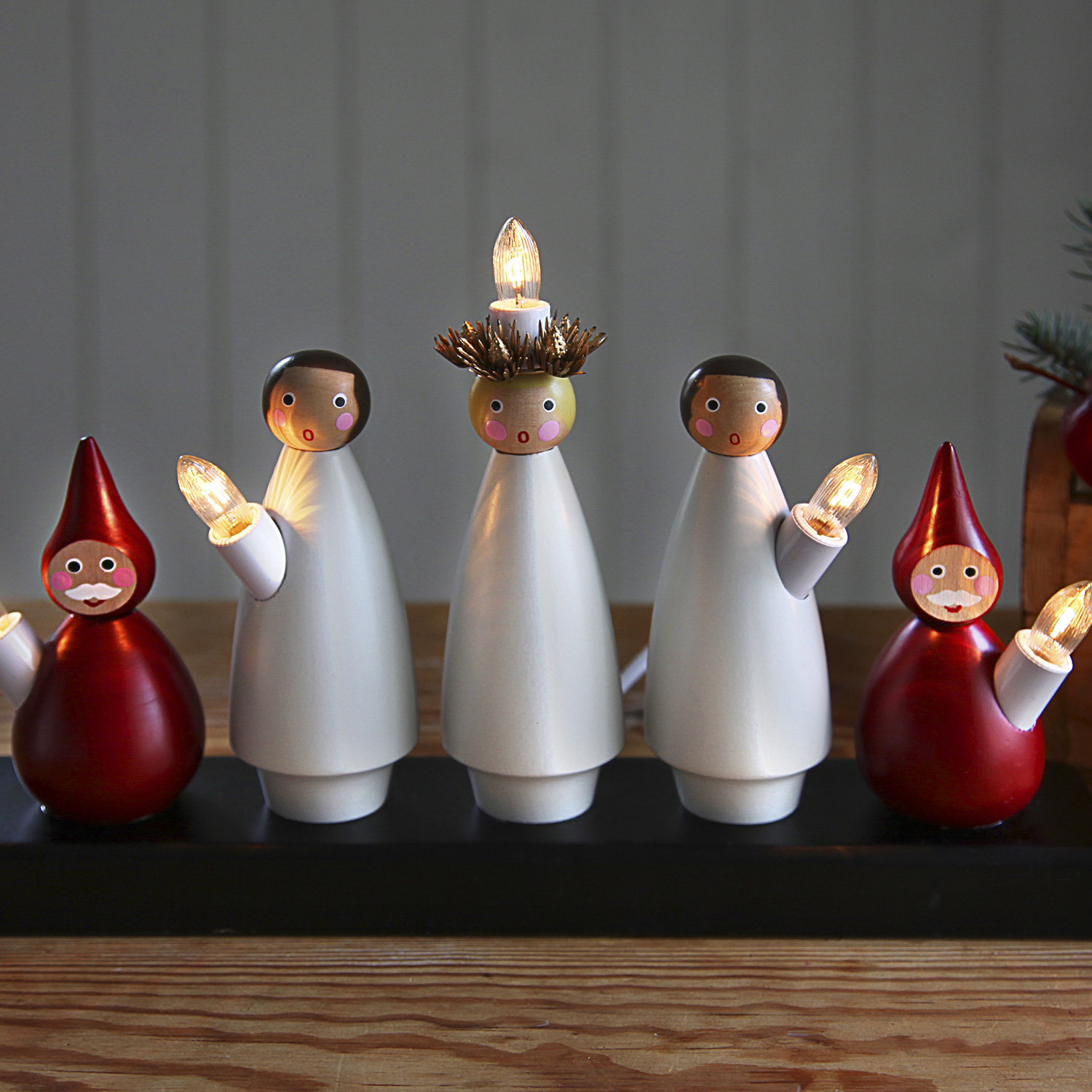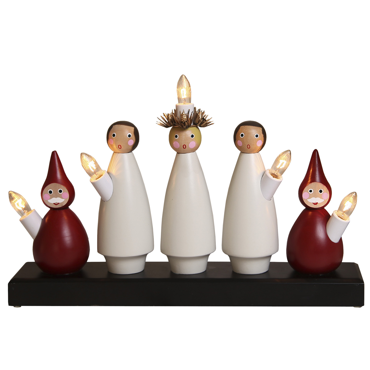 Dieser wunderschön gestaltete Holzleuchter basiert auf dem nordischen Luciafest, das am 13. Dezember gefeiert wird. Er steht in vielen Wohnungen schon von November an bis in den Januar. Die 5 Figuren die hier Spalier stehen, tragen jeweils eine warmweiß leuchtende Glühlampe in Kerzenform.
