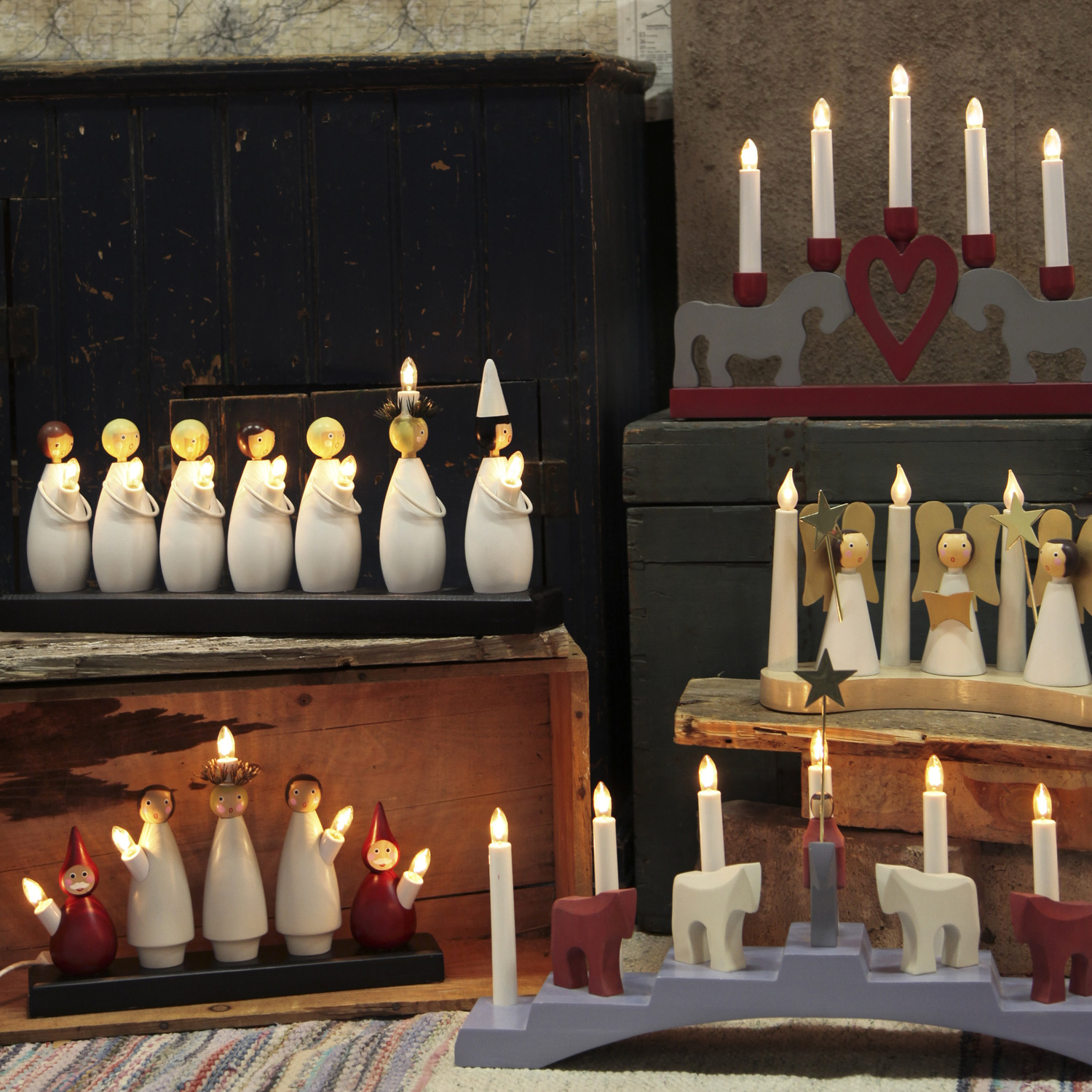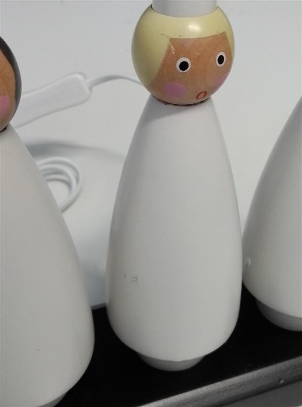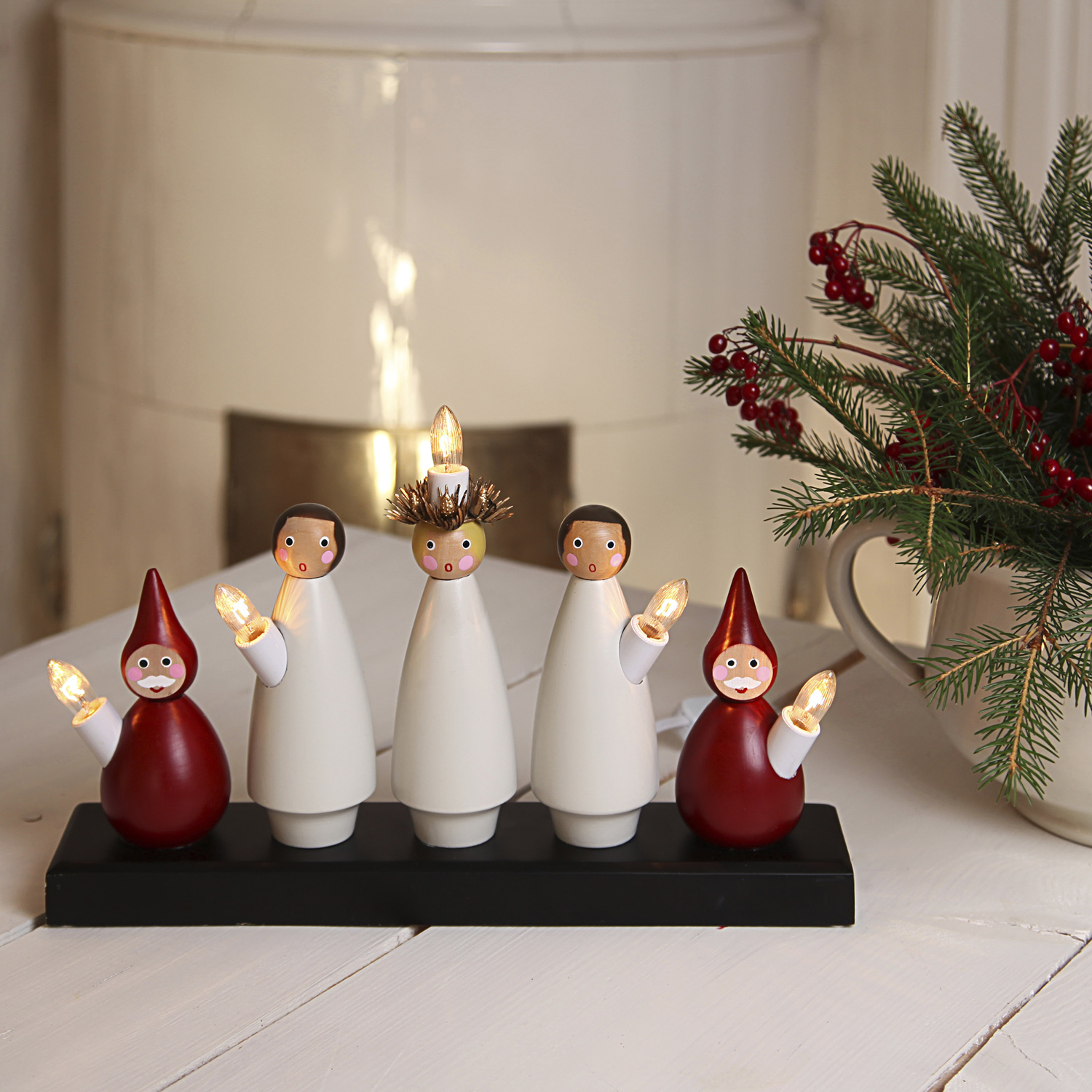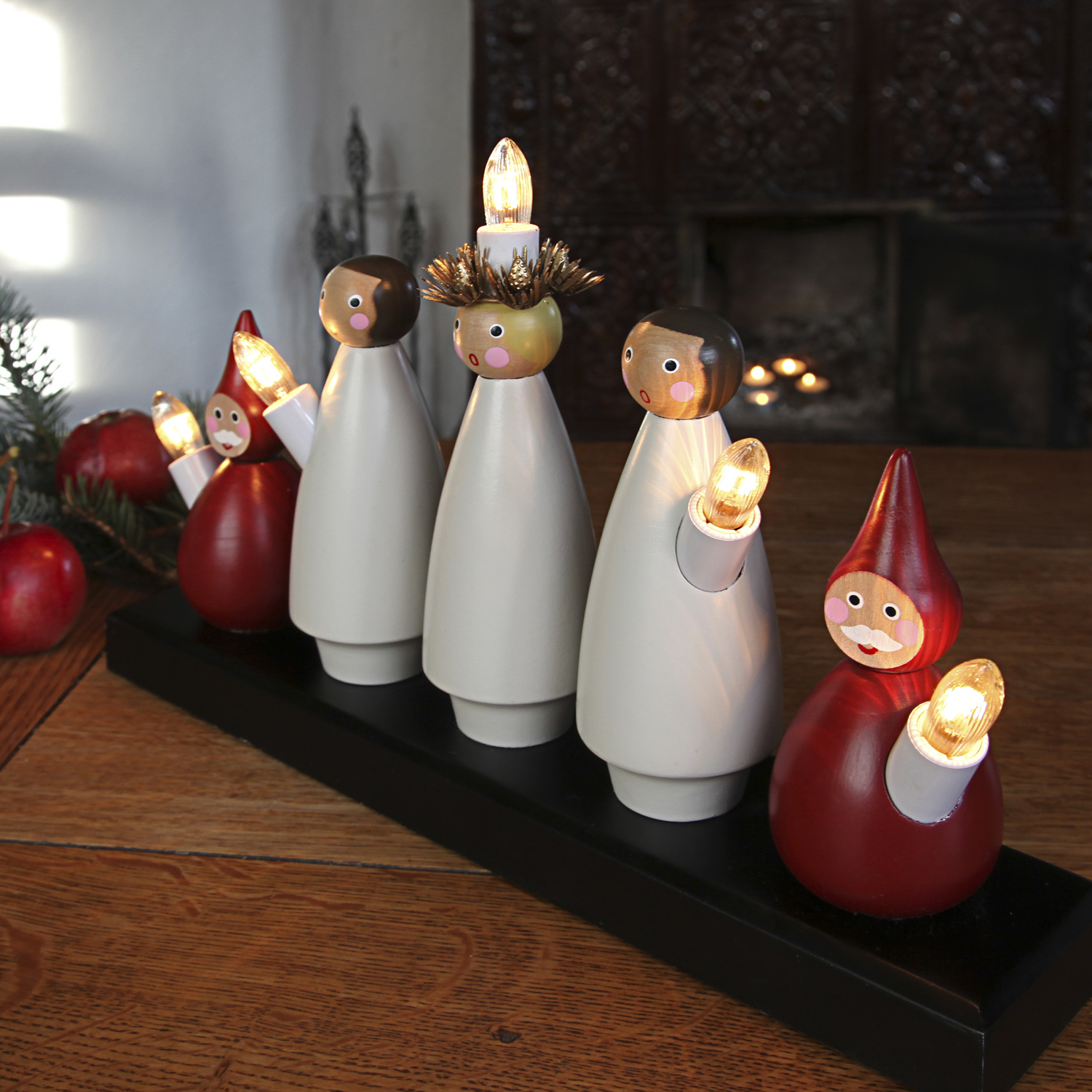 Dieser wunderschön gestaltete Holzleuchter basiert auf dem nordischen Luciafest, das am 13. Dezember gefeiert wird. Er steht in vielen Wohnungen schon von November an bis in den Januar. Die 5 Figuren die hier Spalier stehen, tragen jeweils eine warmweiß leuchtende Glühlampe in Kerzenform.
