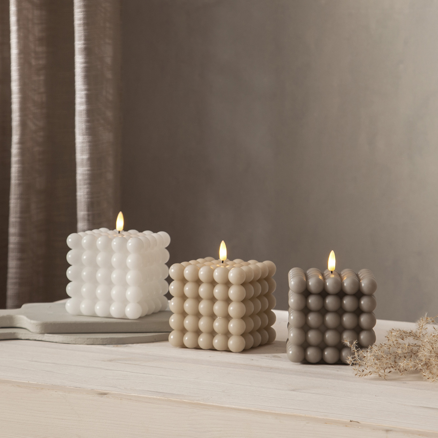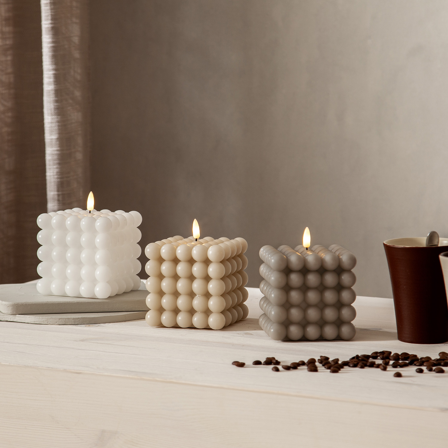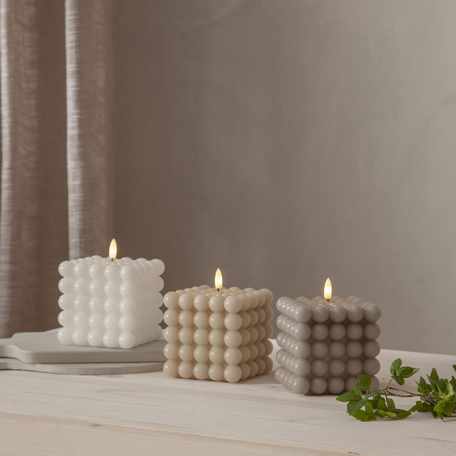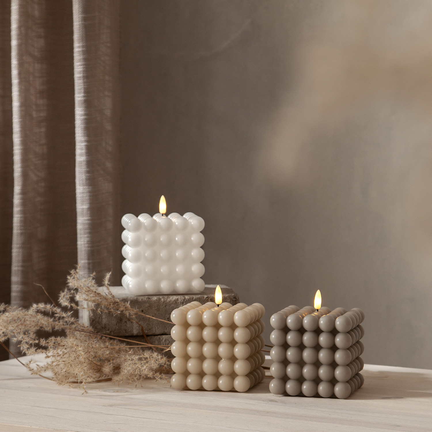 LED Kerze Bubble - Würfelkerze - Echtwachs - realistische 3D Flamme - H: 12,5cm - Timer - creme