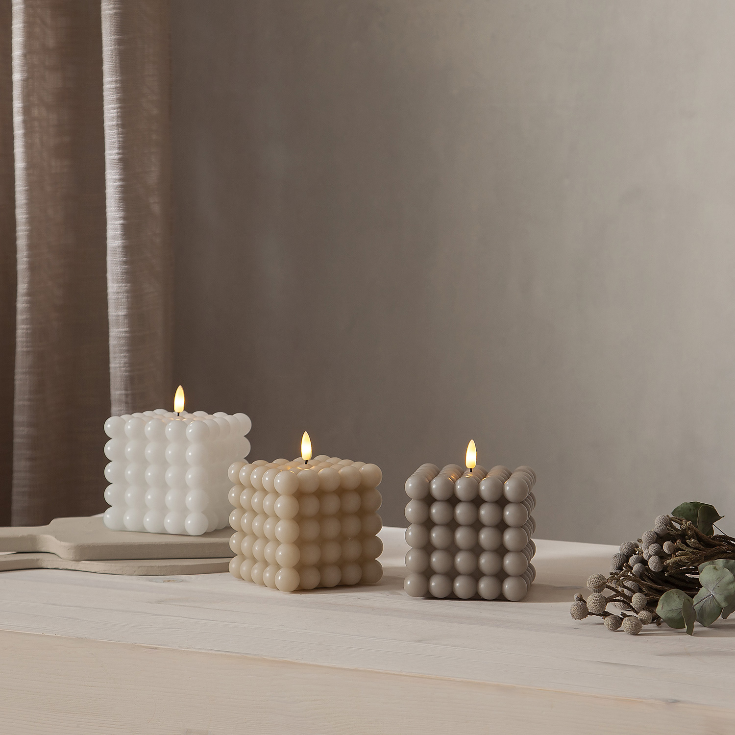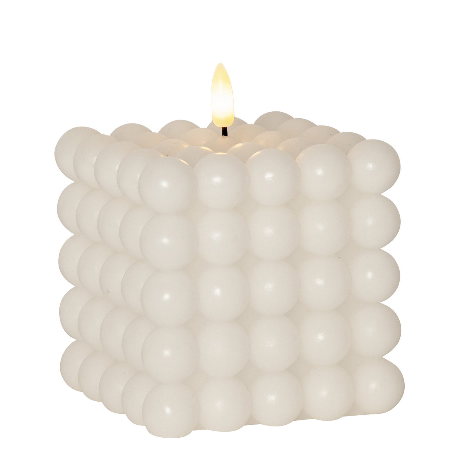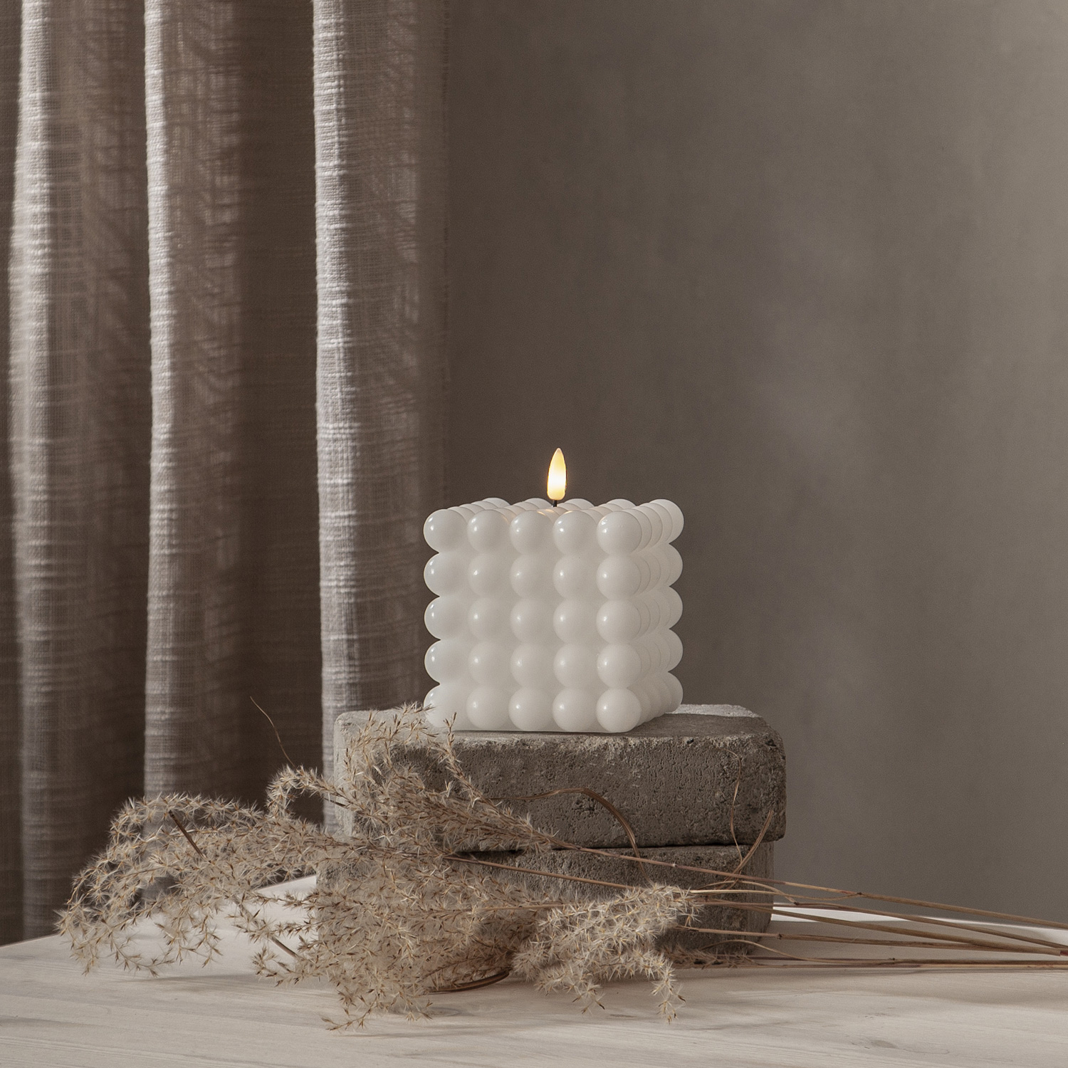 LED Kerze Bubble - Würfelkerze - Echtwachs - realistische 3D Flamme - H: 12,5cm - Timer - weiß