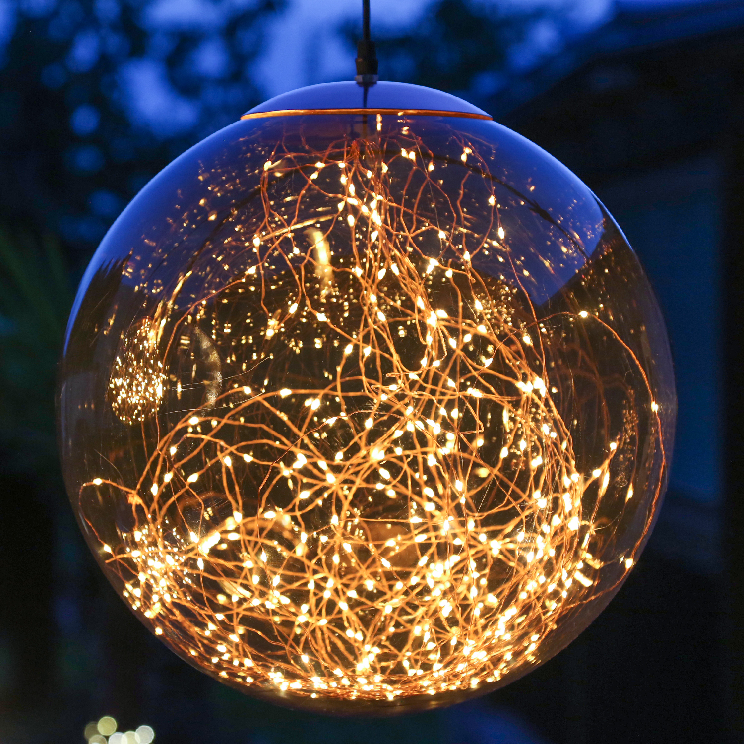Die hängende LED Kugellampe ist die perfekte Dekoration für Deinen Garten, auf dem Balkon oder auf der Terrasse. Aber auch in Deinem Wohnbereich an der Wand oder einem Schrank macht diese Kugellampe richtig was her. Die Rauchglasoptik der Dekokugel mit der bernsteinfarbenen LED Drahtlichterkette sieht einfach klasse aus.