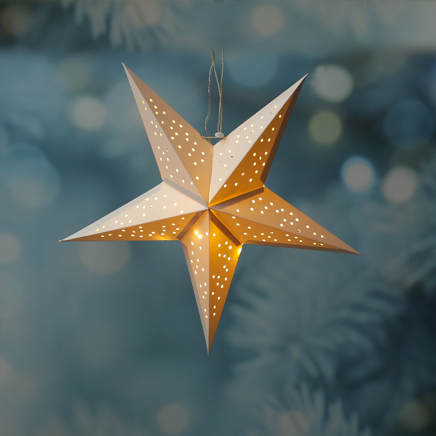 Füge deinem Fest ein besonderes Highlight hinzu – den LED Papierstern. Dieser zauberhafte 5-zackige Stern mit ausgestanzten Punkt-Muster hebt sich von anderen ab. Im Inneren erstrahlt nicht nur eine einzelne Lichtquelle, sondern eine Kette aus 10 warmweißen LED, die den Stern in ein sanftes Licht tauchen.